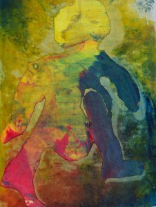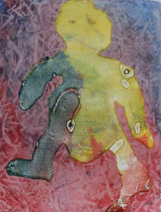 I  went to town here truly inspired by this fantasy world rising out of some quagmire of flames and mud or maybe the womb. The combination of the paper figures and machine stitching adds to the movement out of the ” solid frame” in the corner in an upward drift out to infinity. I am constantly amazed at how long one can go with a given technique, sometimes successfully and sometimes not but in my last session I feel that I was successful bringing more body to the ghost figures that often are a part of my prints.                                      I spent last week in Bødker Gården in Køge.